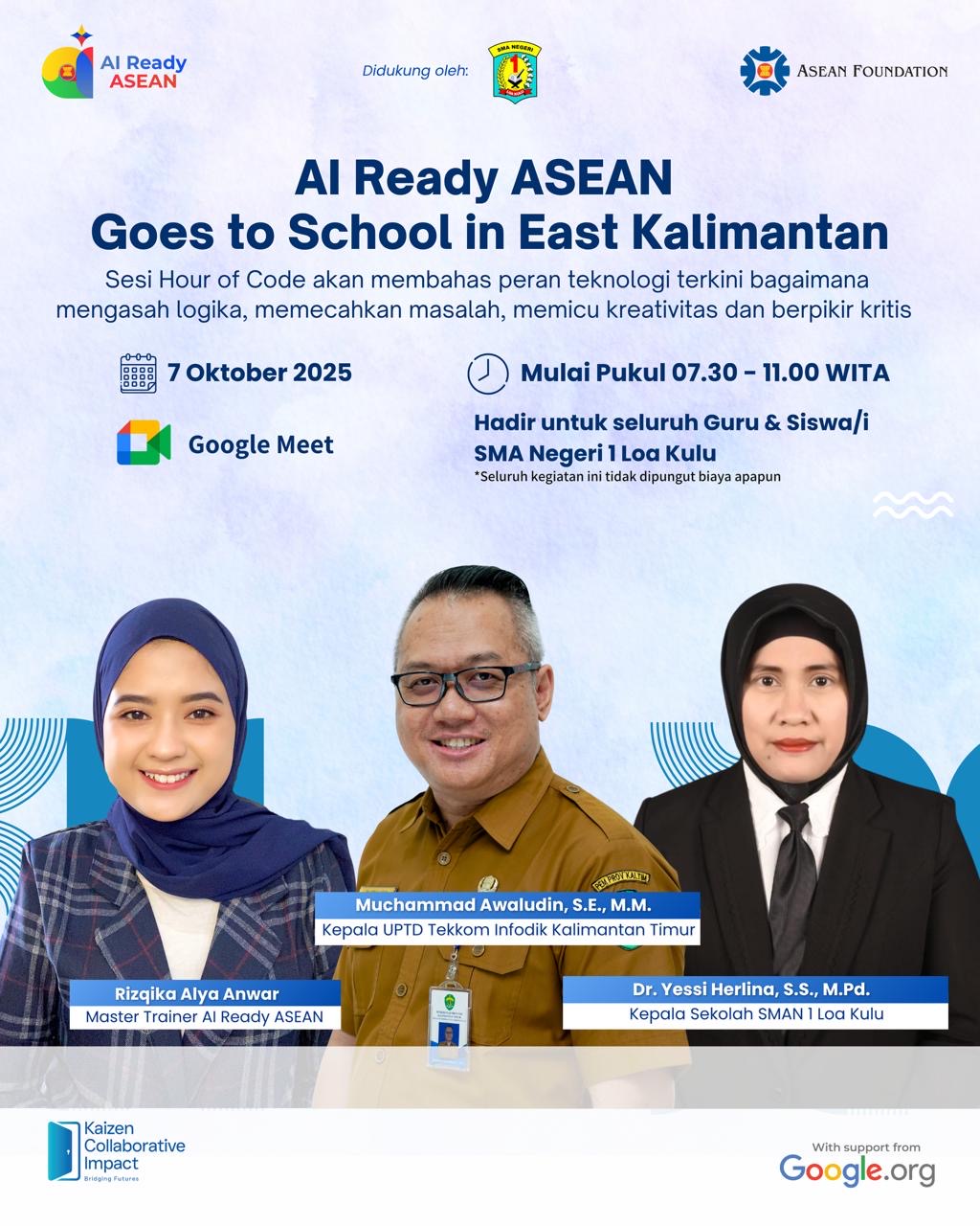 Dinas Pendidikan dan Kebudayaan Provinsi Kalimantan Timur bekerja sama dengan Kaizen Collaborative Impact dan ASEAN Foundation menggelar Piloting Program AI Ready ASEAN yang akan berlangsung pada 30 September hingga 10 Oktober 2025. Program ini menyasar guru dan peserta didik SMA/SMK di sejumlah kabupaten/kota di Kaltim.