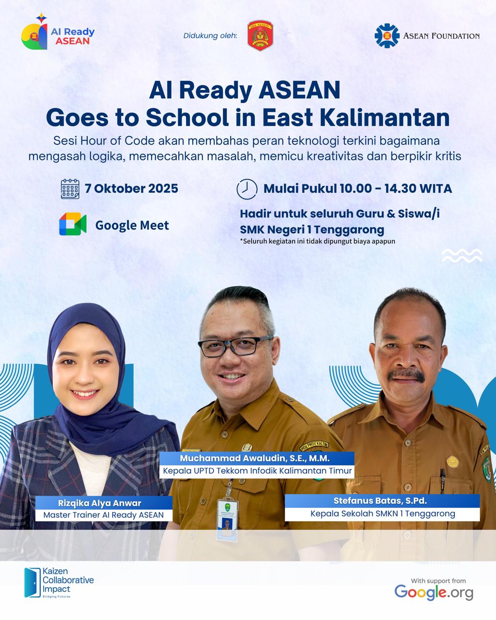 Dinas Pendidikan dan Kebudayaan Provinsi Kalimantan Timur bekerja sama dengan Kaizen Collaborative Impact dan ASEAN Foundation menggelar Piloting Program AI Ready ASEAN yang akan berlangsung pada 30 September hingga 10 Oktober 2025. Program ini menyasar guru dan peserta didik SMA/SMK di sejumlah kabupaten/kota di Kaltim.