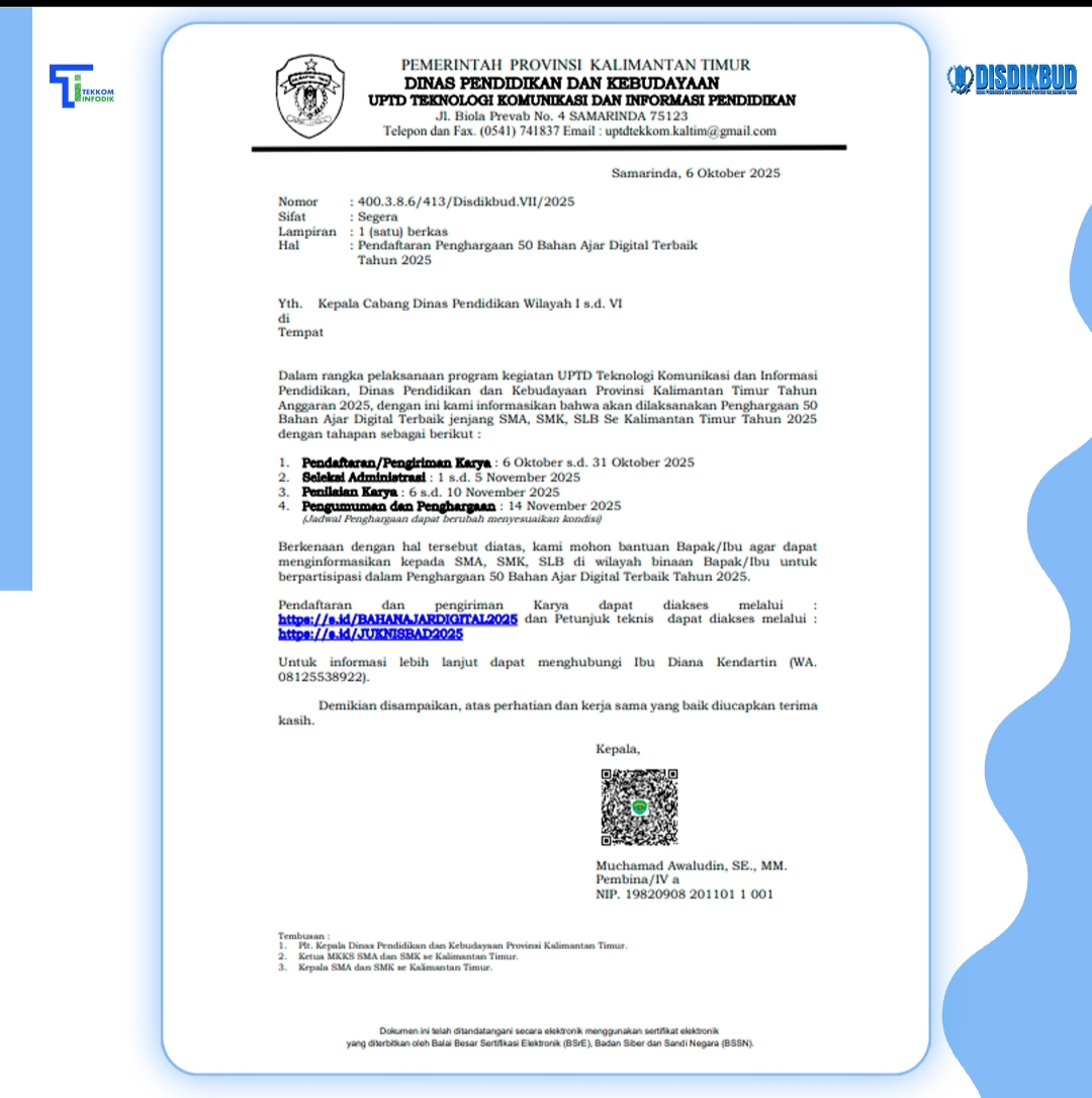 Dinas Pendidikan dan Kebudayaan Provinsi Kalimantan Timur melalui UPTD Teknologi Komunikasi dan Informasi Pendidikan mengundang guru-guru SMA, SMK, dan SLB se-Kalimantan Timur untuk berpartisipasi dalam kegiatan Penghargaan 50 Bahan Ajar Digital Terbaik Tahun 2025.